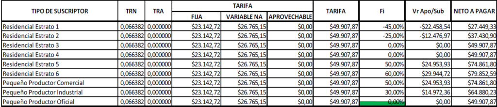 Una vez aplicados los porcentajes de aportes y subsidios (Fi) aprobados por el Honorable Concejo Municipal mediante Acuerdo No. 016 del 22 de noviembre de 2020, se obtienen las siguientes tarifas por tipo de usuario: